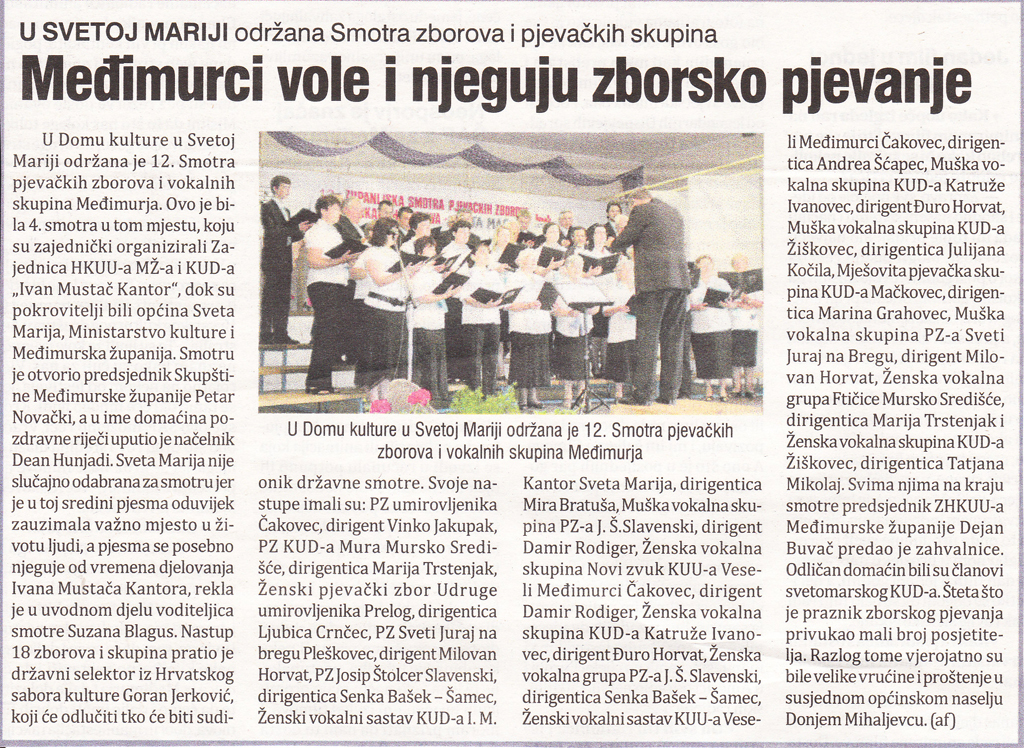 U Domu kulture u Svetoj Mariji 13.lipnja 2010. godine održana je 12. smotra pjevačkih zborova i vokalnih skupina Međimurja. Nastup 18 zborova i vokalnih skupina budno je pratio i državni selektor iz Hrvatskog sabora kulture Goran Jerković.